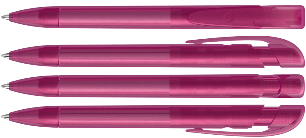 Druckkugelschreiber mit transparent gefrostetem Gehäuse, breitem Bogenclipdrücker und Spitze.