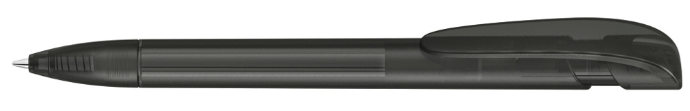 Druckkugelschreiber mit transparent gefrostetem Gehäuse, breitem Bogenclipdrücker und Spitze.