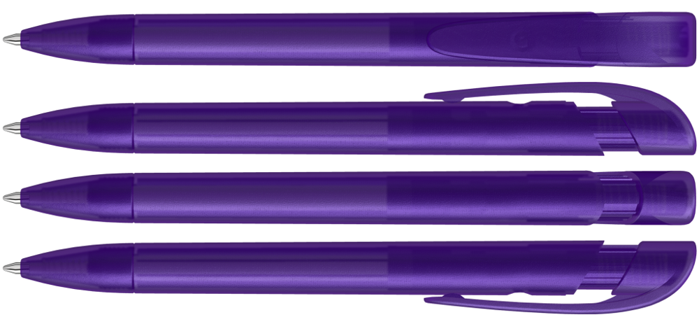 Druckkugelschreiber mit transparent gefrostetem Gehäuse, breitem Bogenclipdrücker und Spitze.