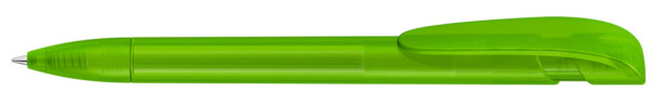 Druckkugelschreiber mit transparent gefrostetem Gehäuse, breitem Bogenclipdrücker und Spitze.