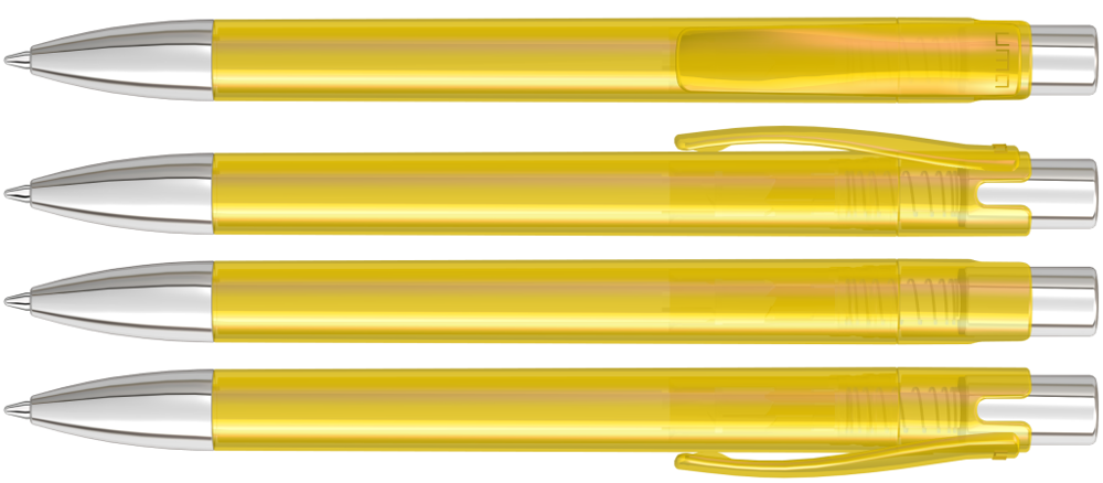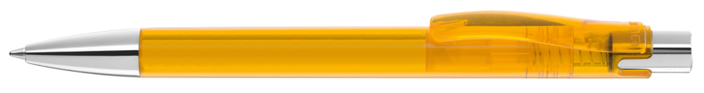 Druckkugelschreiber mit transparent glänzendem Gehäuse, Metalldrücker und schwerer Metallspitze glanzverchromt.