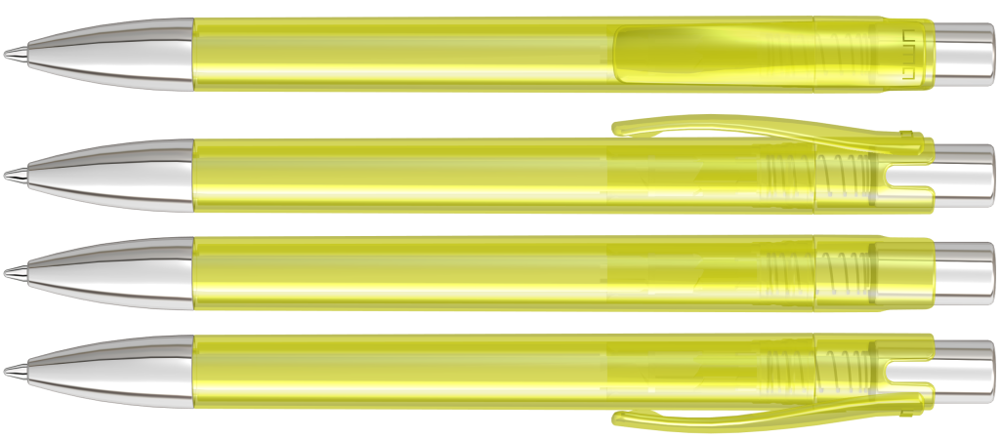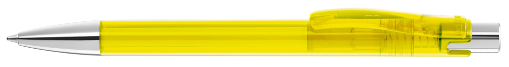 Druckkugelschreiber mit transparent glänzendem Gehäuse, Metalldrücker und schwerer Metallspitze glanzverchromt.