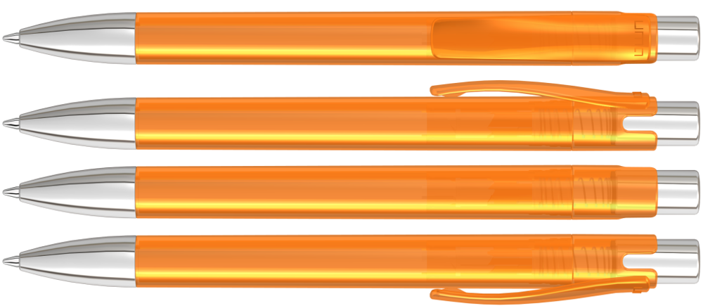 Druckkugelschreiber mit transparent glänzendem Gehäuse, Metalldrücker und schwerer Metallspitze glanzverchromt.