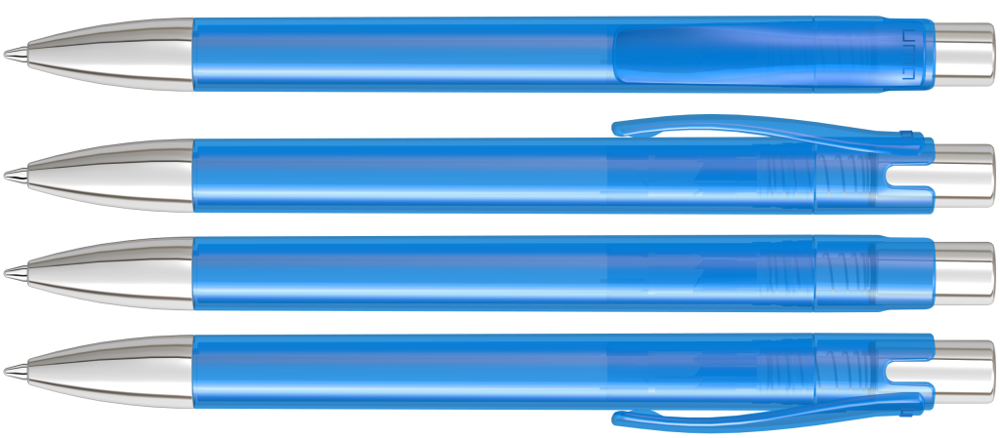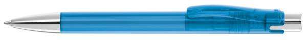 Druckkugelschreiber mit transparent glänzendem Gehäuse, Metalldrücker und schwerer Metallspitze glanzverchromt.