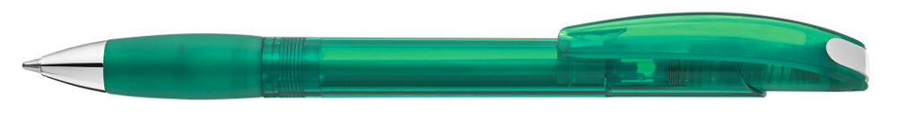 Druckkugelschreiber mit transparent glänzendem Gehäuse, Gummigriffzone und Clipdrücker. Drückerstopfen und Spitze silber glänzend.