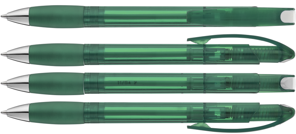Druckkugelschreiber mit transparent glänzendem Gehäuse, Gummigriffzone und Clipdrücker.... mehr