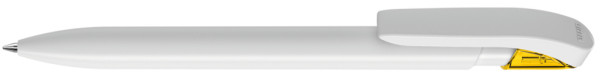 Druckkugelschreiber mit gedeckt glänzendem Gehäuse in uni weiß oder schwarz und farbig transparent glänzende Manschette.
