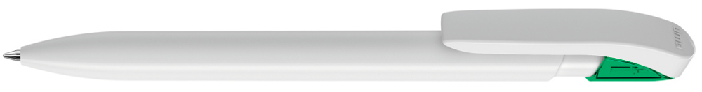 Druckkugelschreiber mit gedeckt glänzendem Gehäuse in uni weiß oder schwarz und farbig transparent glänzende Manschette.