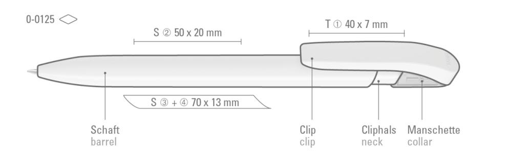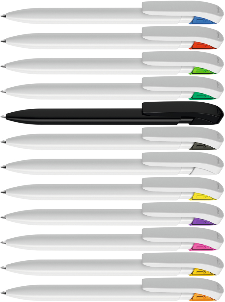 Druckkugelschreiber mit gedeckt glänzendem Gehäuse in uni weiß oder schwarz und farbig transparent glänzende Manschette.