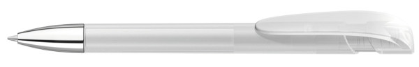 Druckkugelschreiber mit transparent gefrostetem Gehäuse, breitem Bogenclipdrücker und silberner Spitze glanzverchromt.
