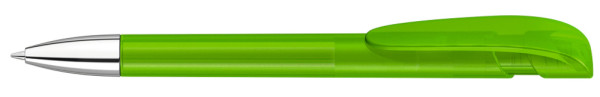 Druckkugelschreiber mit transparent gefrostetem Gehäuse, breitem Bogenclipdrücker und silberner Spitze glanzverchromt.