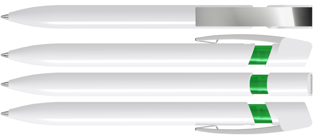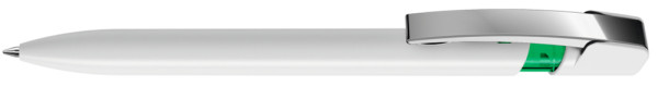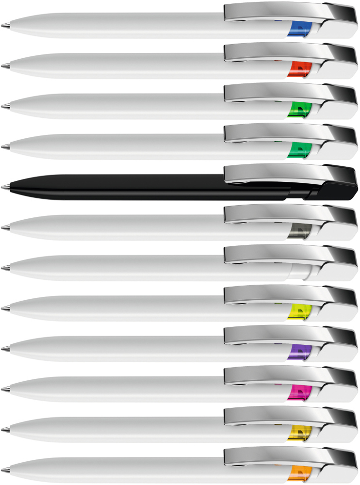 Druckkugelschreiber mit gedeckt glänzendem Gehäuse in uni weiß oder schwarz und farbig transparent glänzendem Cliphals, flexiblem Metallclip glanzverchromt.
