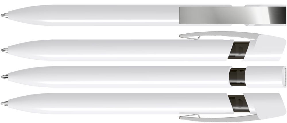 Druckkugelschreiber mit gedeckt glänzendem Gehäuse in uni weiß oder schwarz und farbig transparent glänzendem Cliphals, flexiblem Metallclip glanzverchromt.