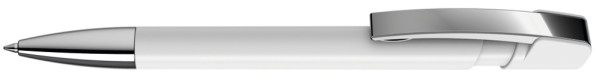 Druckkugelschreiber mit gedeckt glänzendem Gehäuse in uni weiß oder schwarz, flexiblem Metallclip und schwerer Metallspitze glanzverchromt.