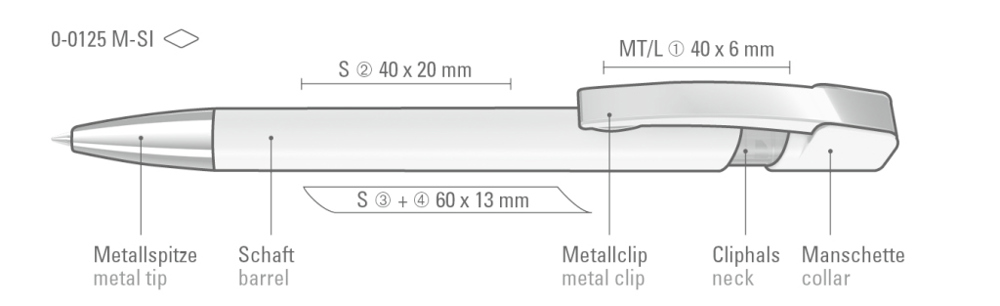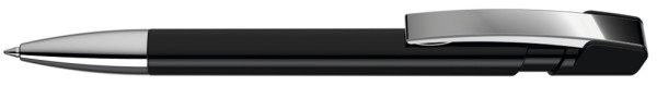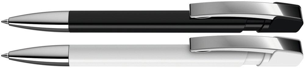 Druckkugelschreiber mit gedeckt glänzendem Gehäuse in uni weiß oder schwarz, flexiblem Metallclip und schwerer Metallspitze glanzverchromt.