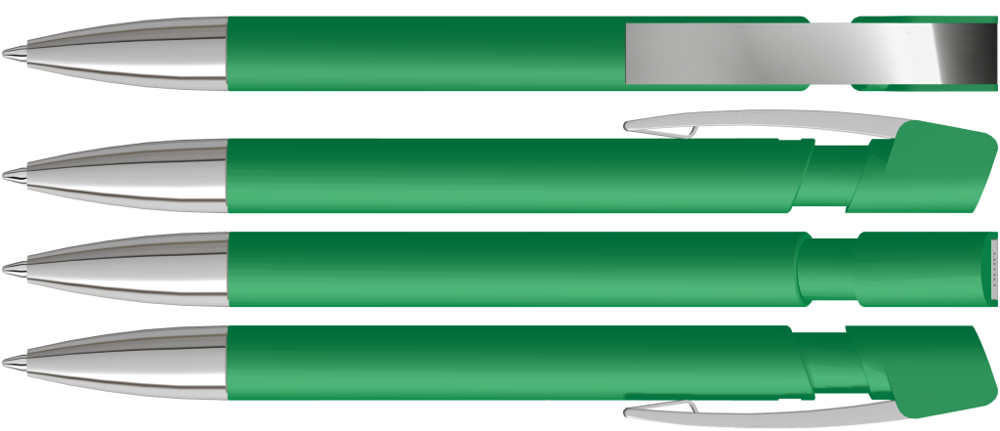Druckkugelschreiber mit Softtouch-Gehäuse, flexiblem Metallclip und schwerer Metallspitze glanzverchromt.
