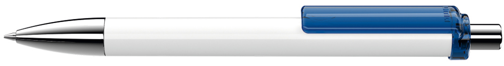 Druckkugelschreiber mit gedeckt glänzendem Schaft, transparent glänzendem Clip, Metallspitze und Metalldrücker glanzverchromt.