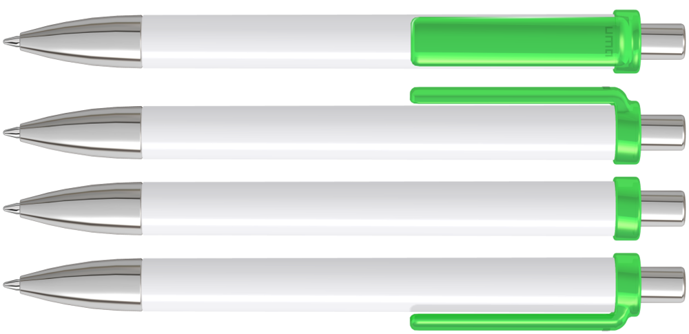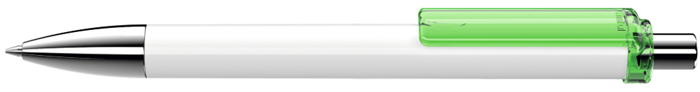 Druckkugelschreiber mit gedeckt glänzendem Schaft, transparent glänzendem Clip, Metallspitze und Metalldrücker glanzverchromt.