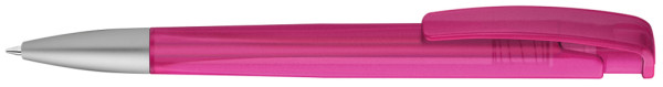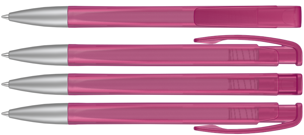 Druckkugelschreiber mit geometrisch wechselnder Schaftform, transparent gefrostetem Gehäuse und Metallspitze matt verchromt.