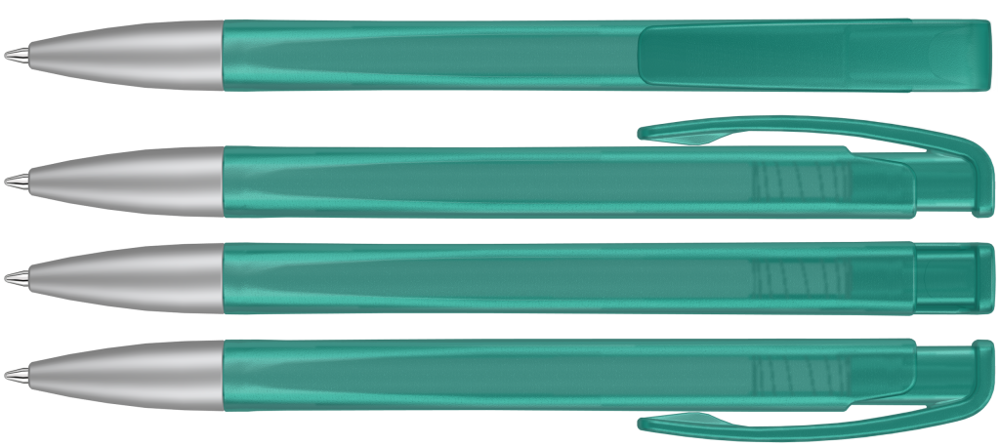 Druckkugelschreiber mit geometrisch wechselnder Schaftform, transparent gefrostetem Gehäuse und Metallspitze matt verchromt.