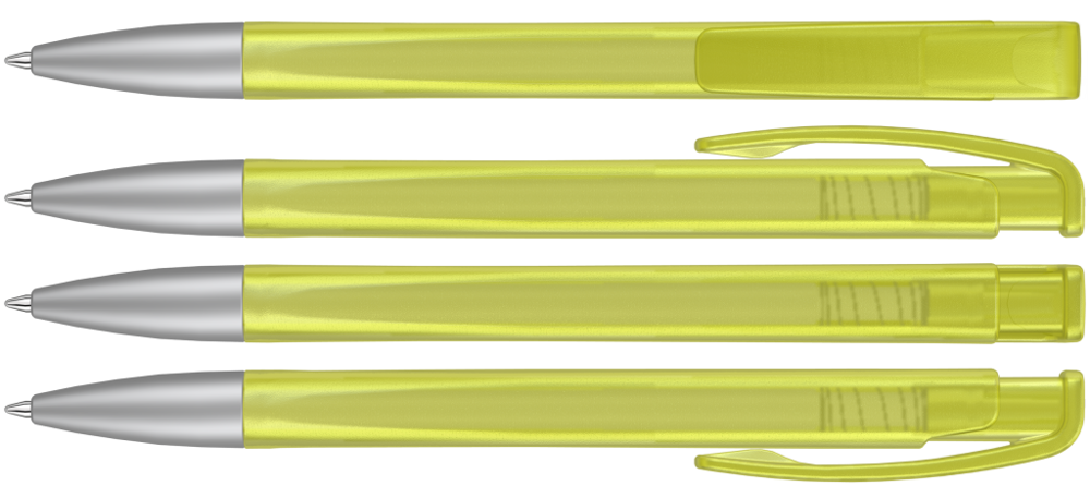 Druckkugelschreiber mit geometrisch wechselnder Schaftform, transparent gefrostetem Gehäuse und Metallspitze matt verchromt.