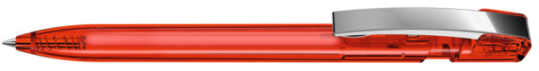 Druckkugelschreiber mit transparent glänzendem Gehäuse und flexiblem Metallclip glanzverchromt.