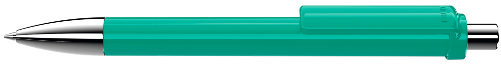 Druckkugelschreiber mit gedeckt glänzendem Schaft und Clip, Metallspitze und Metalldrücker glanzverchromt.