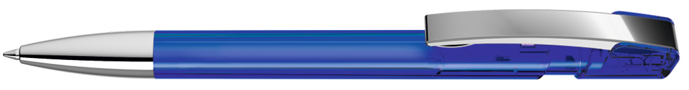Druckkugelschreiber mit transparent glänzendem Gehäuse, flexiblem Metallclip und schwerer Metallspitze glanzverchromt.
