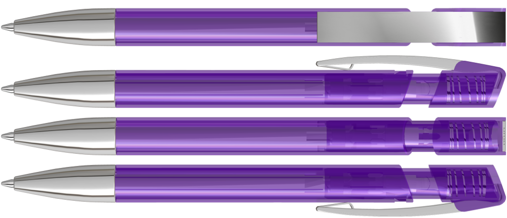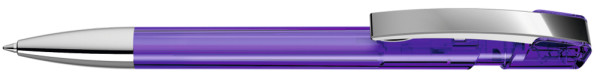Druckkugelschreiber mit transparent glänzendem Gehäuse, flexiblem Metallclip und schwerer Metallspitze glanzverchromt.