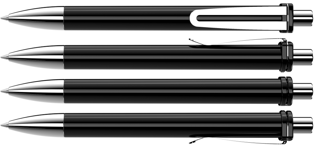 Druckkugelschreiber mit gedeckt glänzendem Schaft und Clipaufhängung. Breiter Metallbiegeclip, Metallspitze und Metalldrücker glanzverchromt.