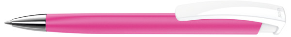 Druckkugelschreiber mit gummiertem Dreikantgehäuse, weiß gedeckt glänzendem Clip und schwerer Metallspitze glanzverchromt.