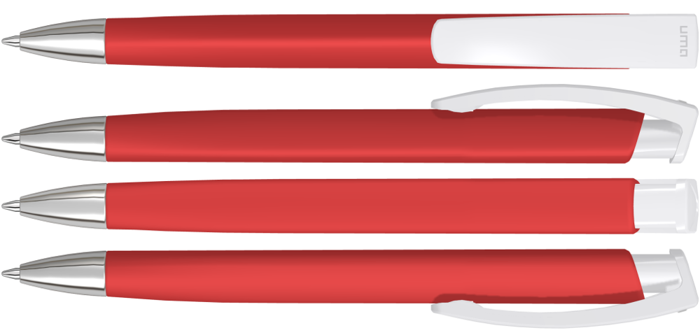 Druckkugelschreiber mit gummiertem Dreikantgehäuse, weiß gedeckt glänzendem Clip und schwerer Metallspitze glanzverchromt.