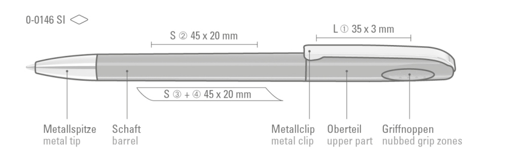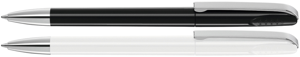 Drehkugelschreiber mit glänzend gedecktem Gehäuse, schwerer Metallspitze und Metallclip. Griffnoppen in der Kappe unterstützen den komfortablen Drehmechanismus.