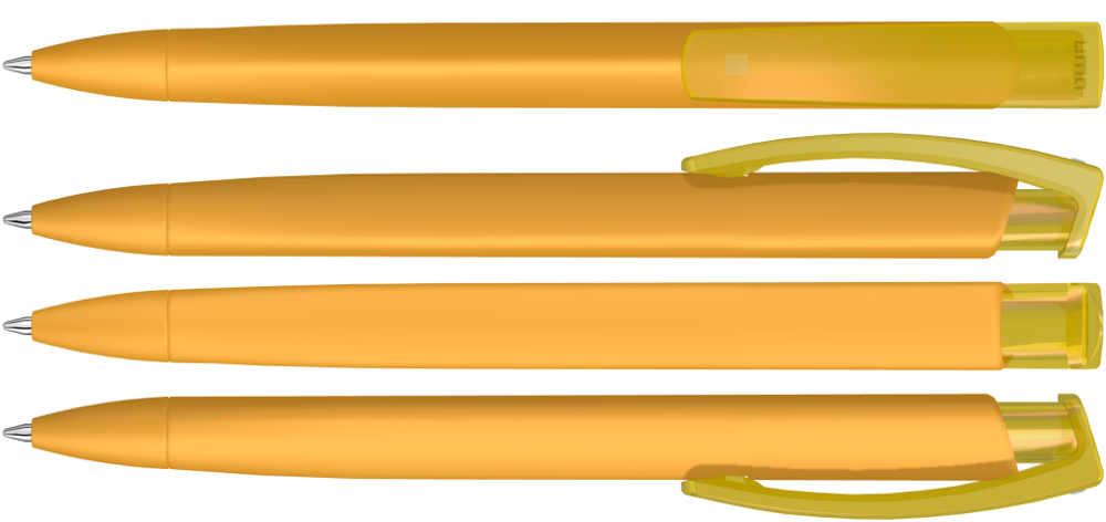 Druckkugelschreiber mit gummiertem Dreikantgehäuse und transparent glänzendem Clip.