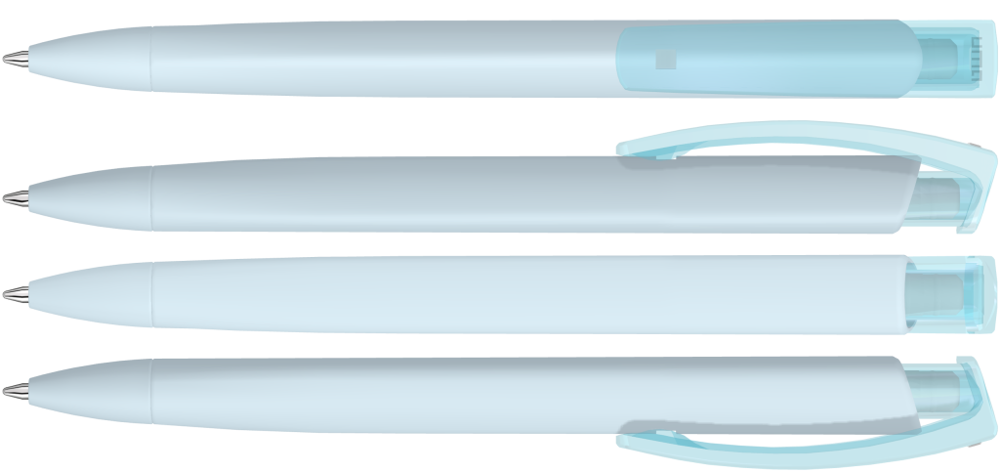Druckkugelschreiber mit gummiertem Dreikantgehäuse und transparent glänzendem Clip. mehr