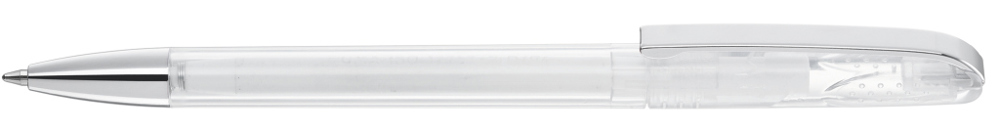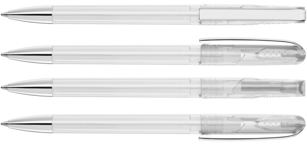 Drehkugelschreiber mit glänzend transparentem Gehäuse, schwerer Metallspitze und Metallclip. Griffnoppen in der Kappe unterstützen den komfortablen Drehmachanismus.