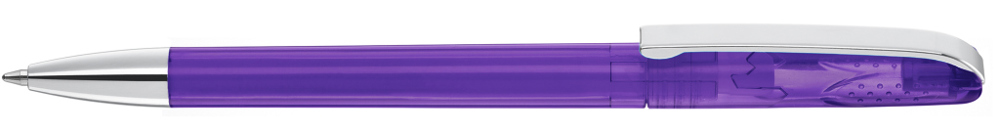Drehkugelschreiber mit glänzend transparentem Gehäuse, schwerer Metallspitze und Metallclip. Griffnoppen in der Kappe unterstützen den komfortablen Drehmachanismus.