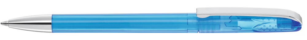 Drehkugelschreiber mit glänzend transparentem Gehäuse, schwerer Metallspitze und Metallclip. Griffnoppen in der Kappe unterstützen den komfortablen Drehmachanismus.
