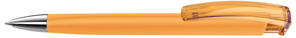 Druckkugelschreiber mit gummiertem Dreikantgehäuse, transparent glänzendem Clip und schwerer Metallspitze glanzverchromt.