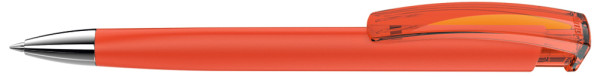 Druckkugelschreiber mit gummiertem Dreikantgehäuse, transparent glänzendem Clip und schwerer Metallspitze glanzverchromt.