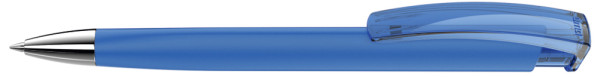 Druckkugelschreiber mit gummiertem Dreikantgehäuse, transparent glänzendem Clip und schwerer Metallspitze glanzverchromt.
