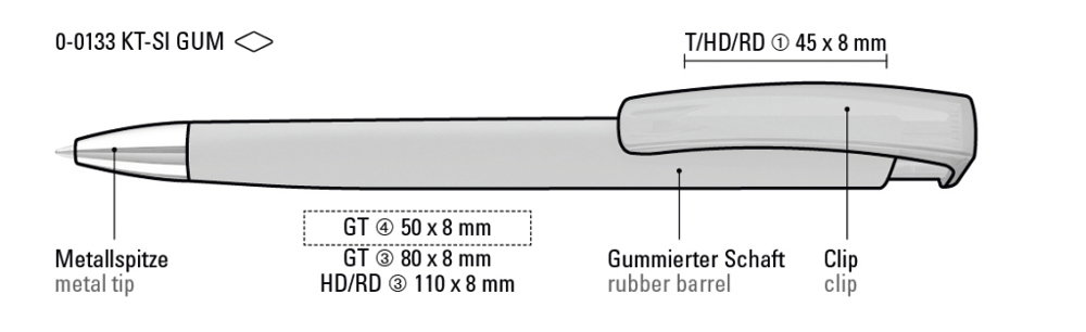 Druckkugelschreiber mit gummiertem Dreikantgehäuse, transparent glänzendem Clip und schwerer Metallspitze glanzverchromt.