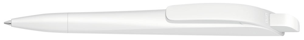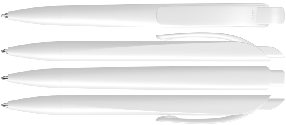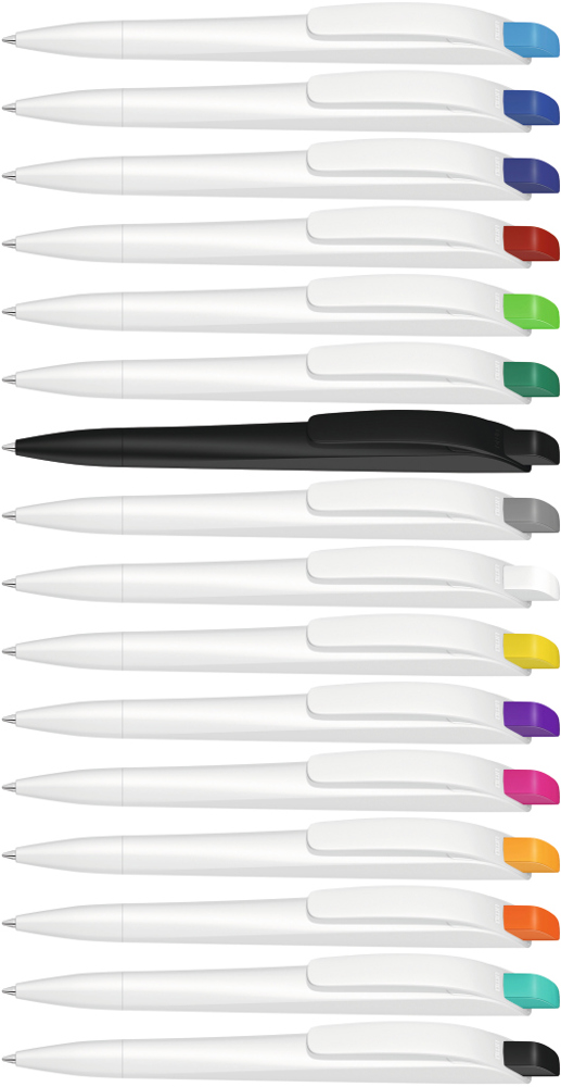 Druckkugelschreiber mit geometrisch wechselnder Schaftform. Gehäuse gedeckt matt schwarz oder weiß mit Bogenclip und farbigem Drücker.