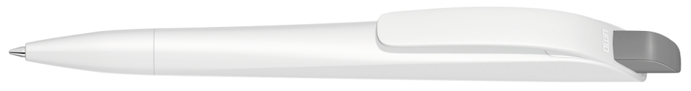 Druckkugelschreiber mit geometrisch wechselnder Schaftform. Gehäuse gedeckt matt schwarz oder weiß mit Bogenclip und farbigem Drücker.