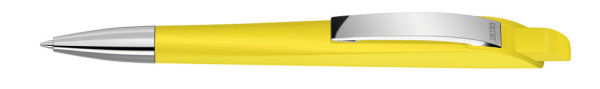 Druckkugelschreiber mit geometrisch wechselnder Schaftform. Gehäuse und Drücker gedeckt matt, Metallclip und Metallspitze glanzverchromt.