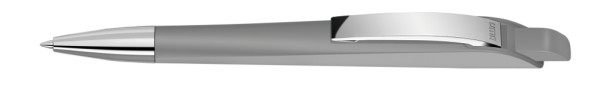 Druckkugelschreiber mit geometrisch wechselnder Schaftform. Gehäuse und Drücker gedeckt matt, Metallclip und Metallspitze glanzverchromt.