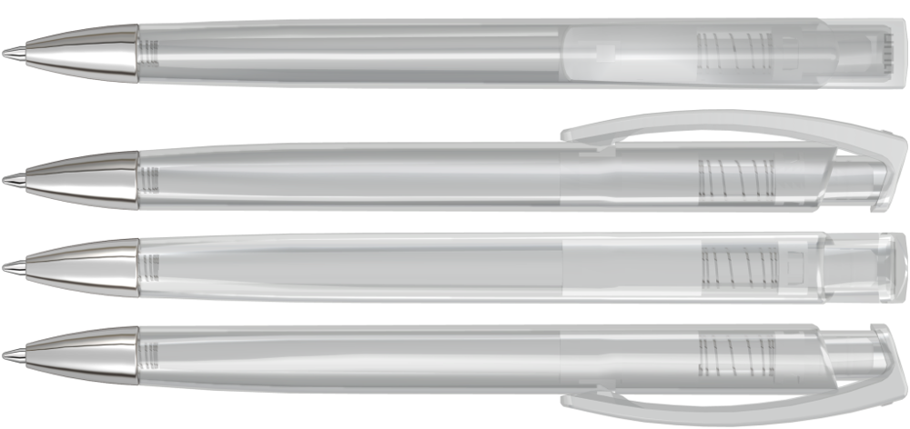 Druckkugelschreiber mit transparent glänzendem Dreikantgehäuse und schwerer Metallspitze glanzverchromt.
