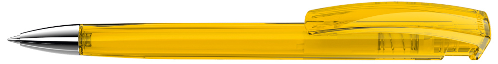 Druckkugelschreiber mit transparent glänzendem Dreikantgehäuse und schwerer Metallspitze glanzverchromt.