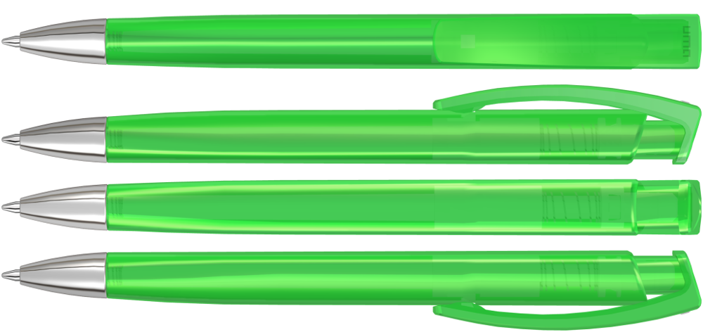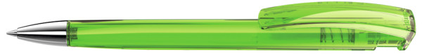 Druckkugelschreiber mit transparent glänzendem Dreikantgehäuse und schwerer Metallspitze glanzverchromt.