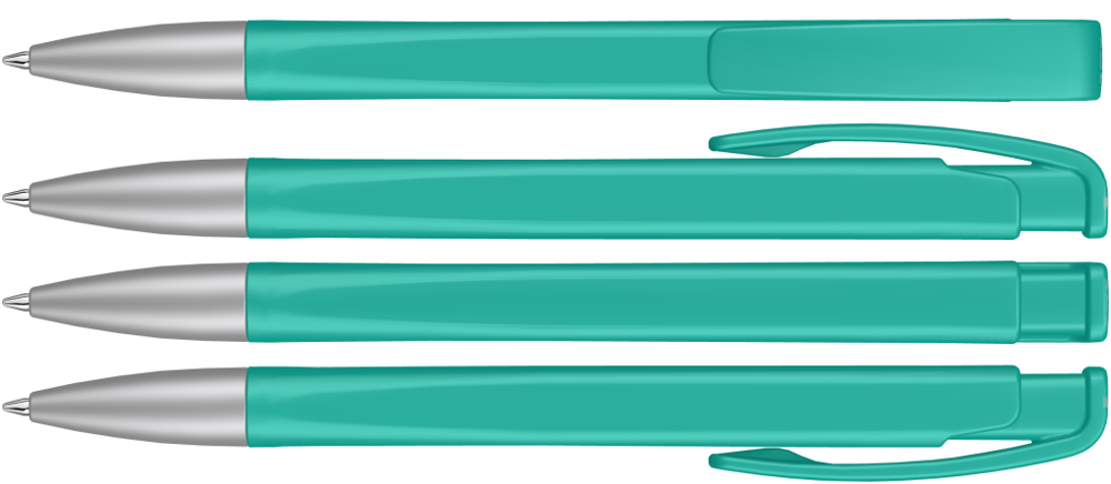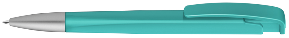 Druckkugelschreiber mit geometrisch wechselnder Schaftform, matt gedecktem Gehäuse und Metallspitze matt verchromt.